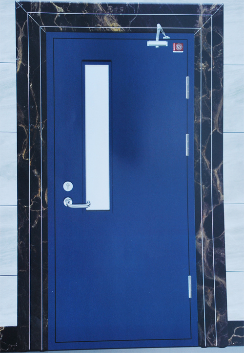 整套鋼質防火門分別由門框、門扇、防火鎖、防火閉門器、防火鉸鏈、防火插銷、防火密封條及順序器(選用)組成。根據需要也可以在門扇上開口鑲嵌安裝A類復合防火玻璃制作防火觀窗及門框上部安裝A類復合防火玻璃制作構成防火亮窗。